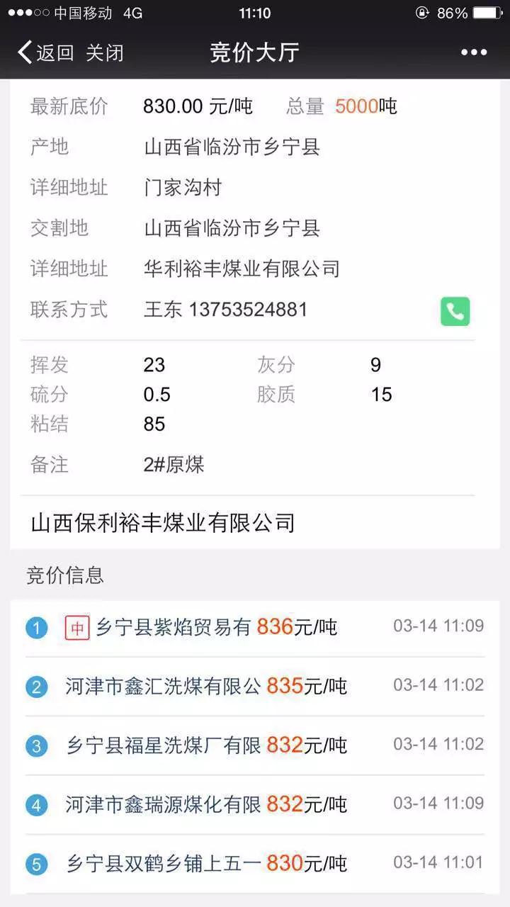 3月14日,山西中煤华利裕丰煤业有限公司举办了2018年第二场煤炭竞价销售活动,分两轮展开,共为煤矿创造了10万元的利润增长。本次竞价共有3家新企业参与,其中乡宁县紫焰贸易有限公司首次竞价就成功中标。第一轮竞价煤种:2号原煤 指标:硫≤0.5%,灰份<9%,挥发份<23%,粘结85左右,Y值≤15竞价总量:5000吨价格类型:承兑价竞价底价:830元/吨中标价:836元/吨创造利润增长:30000元第二轮竞价煤种:2号原煤 指标:硫≤0.5%,灰份<9%,挥发份<23%,粘结85左右,Y值≤15竞价总量:5000吨价格类型:承兑价竞价底价:830元/吨中标价:844元/吨创造利润增长:70000元
